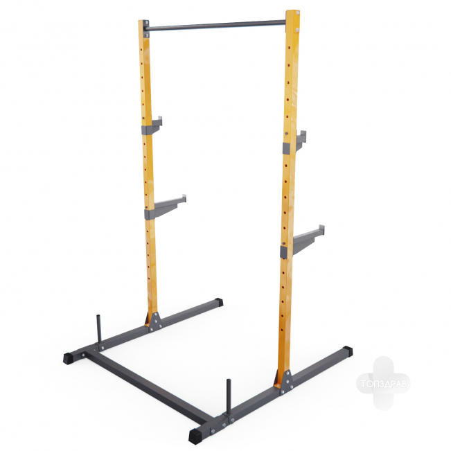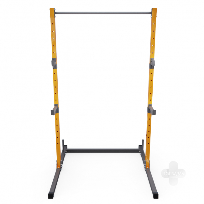 Силовая рама, стойка для штанги с подстраховкой DFC Y-GYM – многофункциональный тренажёр для домашних тренировок. Серия Y-GYM – это тренажеры в современном дизайне, где динамичный желтый цвет гармонично сочетается с элегантным черным. Продуманная геометрия и контрастное цветовое решение позволят тренажеру гармонично вписаться в любую комнату и стать ярким акцентом вашего интерьера. Это идеальное решение для тех, кто ценит функциональность и эстетику в каждой детали своего дома. Устойчивое основание стойки для приседаний из высокопрочной профильной трубы 50 х 50 х 1,5 мм выдерживает динамическую нагрузку до 200 кг (динамическая нагрузка – нагрузка на элементы конструкции в движении). Подходит для выполнения полного спектра упражнений со штангой: от приседаний и становой тяги до жима лежа. Турник 112 см поможет дополнительно разнообразить ваши тренировки. 2 пары держателей для штанги регулируются на 21 уровень по высоте с шагом 8 см. Для хранения дисков предусмотрены 2 держателя по углам тренажера длиной 20 см (Ø25 мм). Нескользящие ножки надежно устанавливаются на полу и не царапают поверхность.